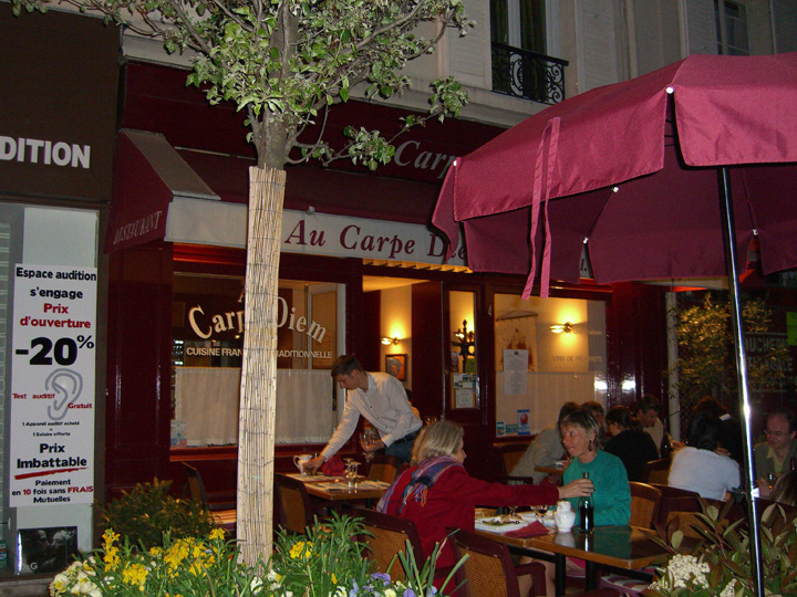 - We wandered a bit in the center of Levallois for a bit, scouting dinner possibilities. We had an espresso to wake up and an aperitif ("that red drink they're having") to relax before dinner. A group of buskers was doing their thing: 2 trumpets, an accordion, and a rhythm machine.
